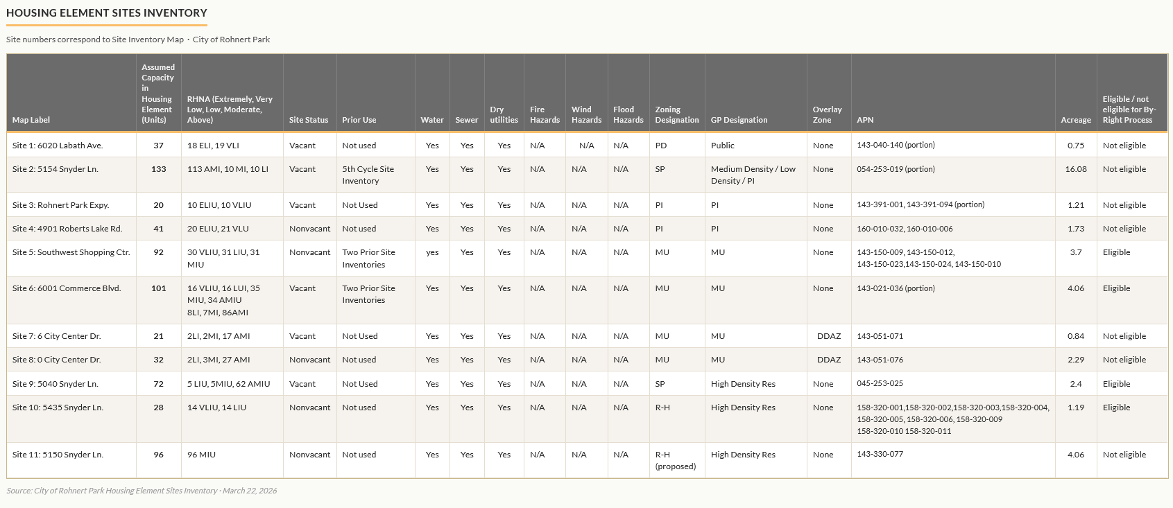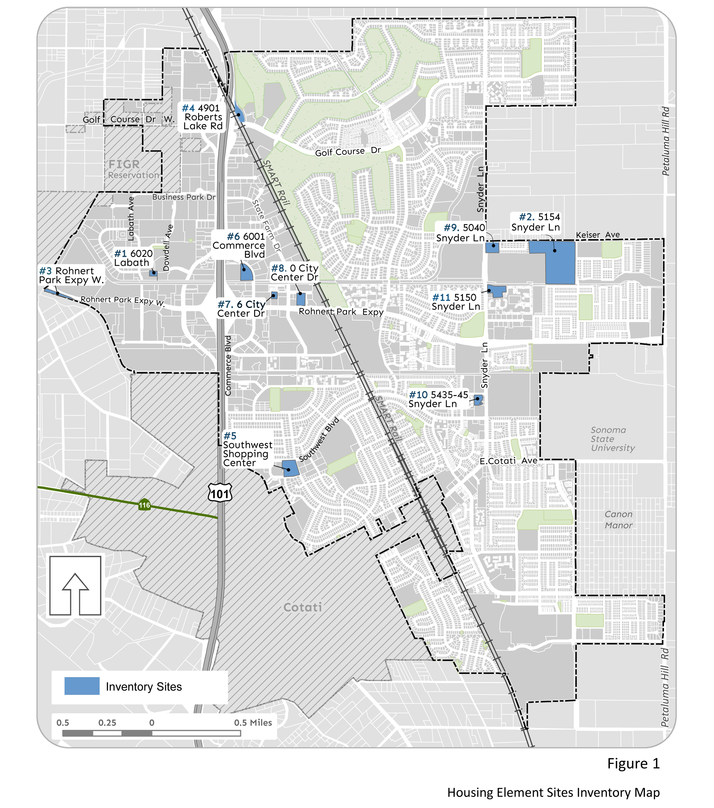 The Housing Element sites inventory identifies specific parcels within a jurisdiction that are suitable and available for residential development to accommodate the City’s Regional Housing Needs Allocation (RHNA) across all income levels. The inventory typically includes information such as site location, size, zoning, allowable density, and realistic development capacity, and is used to demonstrate adequate land is available to meet housing needs during the planning period. See the map and table below for the sites inventory for Rohnert Park.